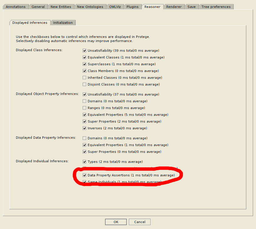 当Pellet能够计算所有这些推论时,Protégé默认只显示对象属性的推论;您必须进入Reasoner > Configure…。菜单,并确保在“显示单个推理”部分下选中了“数据属性断言”选项。打开颗粒推理机并设置此选项在my answer to Ontology property definition in Protégé-OWL / SWRL中有更详细的描述。