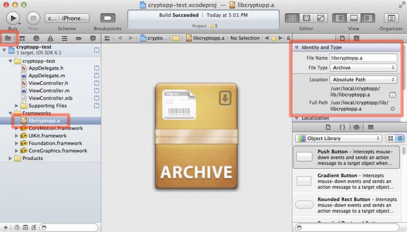 下面是Xcode下的一个类似的例子,我是针对Crypto++而不是OpenSSL链接的。但是,请注意,我指定了存档的完整路径。(这是一个Xcode项目,我在设备上发现了错误,因为它无法加载Crypto++共享对象)。