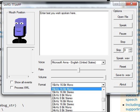 我在Windows上乱搞SAPI,我注意到声音的声音质量很低。通过比较简单测试程序的音频质量和eSpeak提供的各种质量,我得出的结论是,默认质量在16kHz 16 Bit Mono附近。