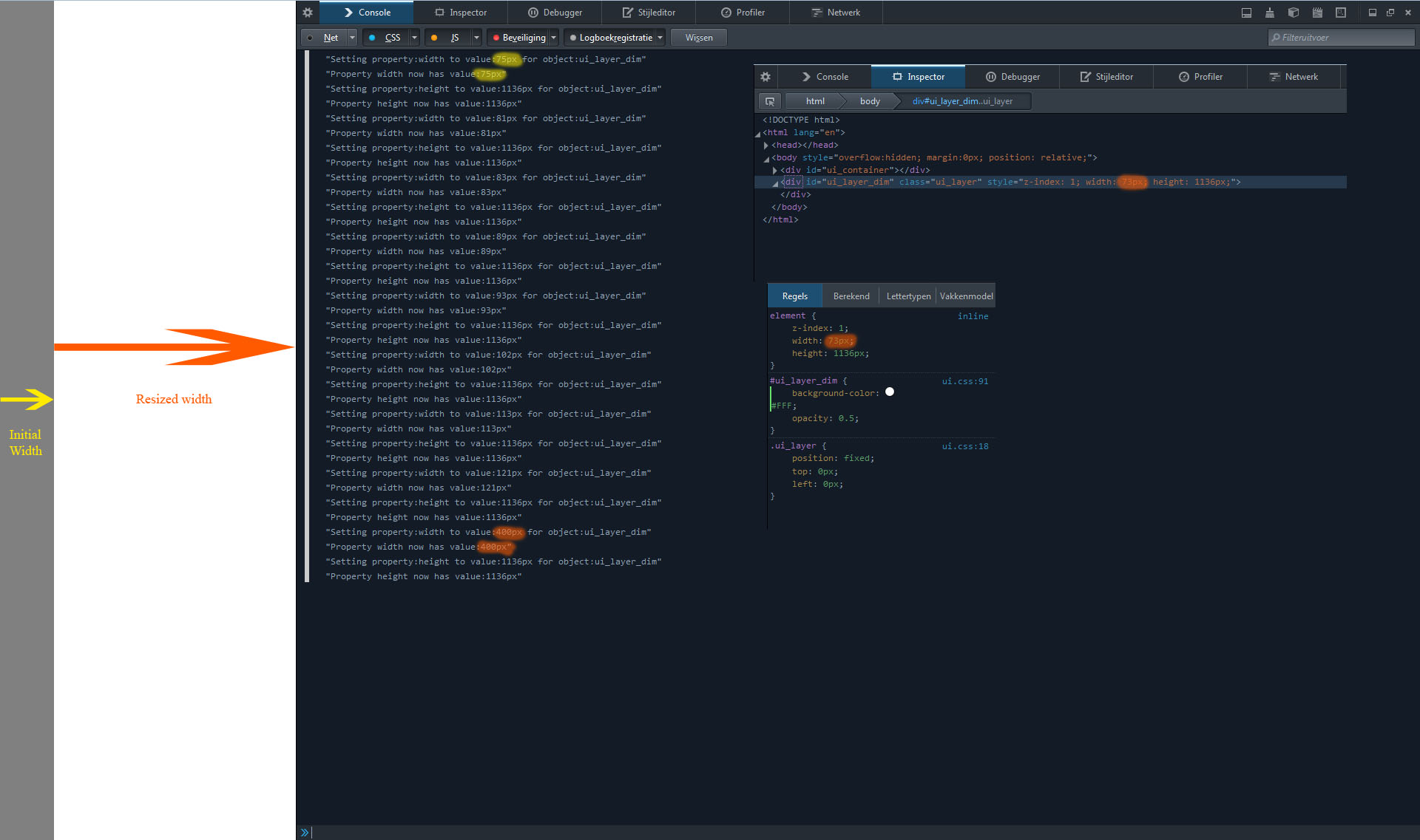 编辑2:这是一个截图,希望能解决我遇到的问题。标记为黄色是浏览器宽度的初始状态,我将其设置为非常窄,以便能够更清楚地显示问题。标记为橙色是在我使浏览器变宽一点之后的状态。您可以看到灰色div没有按照它的需要调整大小,检查器值和CSS规则值也没有调整,但是控制台显示了正确的值。第一个(“设置属性:.”)从window.innerWidth检索到第二个(“属性高度现在有.”)使用style.getPropertyValue从div元素的实际宽度属性中检索。