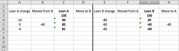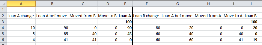 这是两笔贷款。当任何一笔贷款多付时,我想(动态地)将盈余转移到另一笔贷款上。我似乎不知道如何做到这一点,同时避免循环引用。