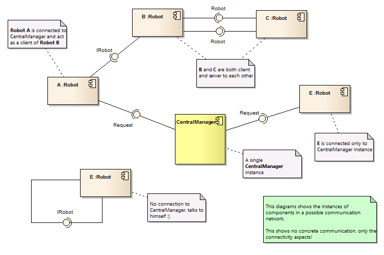 请注意,第一个图应该使用定义所有有效连接可能性的“连接规则”进行扩展。只有一个CentralManager吗?每个机器人必须连接到CentralManager吗?机器人能自言自语吗?等等..。
