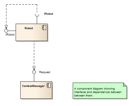 我想在组件图上显示,每个“机器人”组件的子组件“感知”通过一个接口彼此通信。实际上,所有机器人的传感器都被用来估计每个机器人的位置/速度,这是一种协作感知。