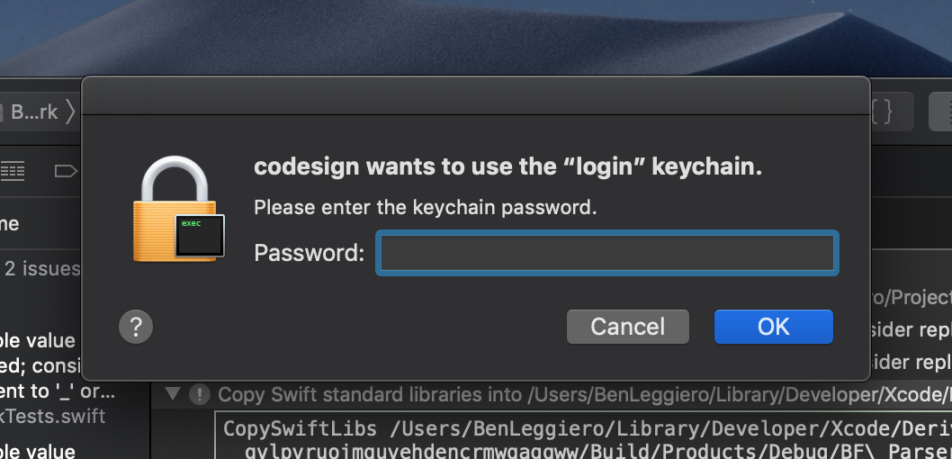 然后返回到Xcode并进行清理和重建。它将提示您再次输入密码以解锁密钥链。