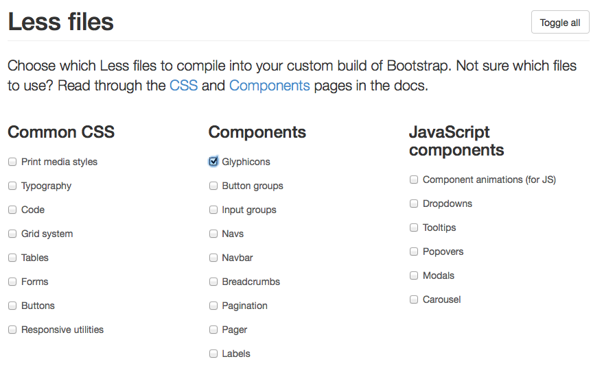 转到GetBootstrap.com自定义程序。关掉所有的东西除了甘露糖。向下滚动,有更多的选择。然后从下载中获取css文件,删除所有基本内容,如normalize和其他不相关的内容。然后创建字体目录,并确保您的站点路径与css匹配,遵循关于如何在其站点上使用的说明。