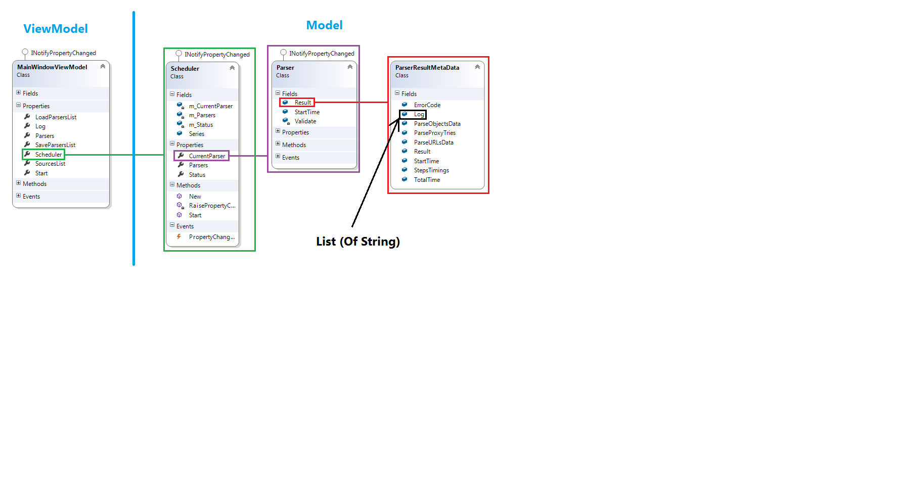虽然像ObservableCollection和INotifyPropertyChanged这样的类型在MVVM体系结构中被广泛使用,但它们并不是特定于它们的,在某些情况下,直接在模型层中使用它们是有意义的。在您的ObservableCollection类中使用Parser是提供此通知机制的一种方法。然后,您可以将ItemsSource的ListBox直接绑定到Scheduler.Parser.Result.Log,并相应地进行更新。