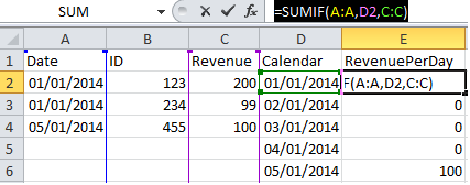 =SUMIF(A:A,D2,C:C)根据A栏中的所有匹配日,将C栏中每一天的总收入计算在内。