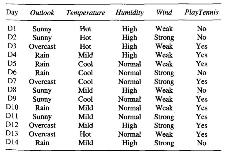例如,Outlook:晴天和湿度:高/正常。有三排“高”的,他们都说不网球。因此,出现了第一个场景,并且可以创建叶子。有更多的信息,但不需要它来作出决定。