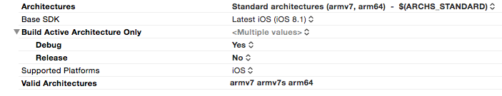 armv7 and armv7s are for 32 bit devices.arm64 is for 64 bit devices只构建活动体系结构: --这是为了指定,是构建所有有效的体系结构,还是只为指定的目标构建。因此,对于Debug,set为Yes,因此它只构建当前体系结构(32位,如果是iPhone 5 64位,如果是iPhone 5s)。并作为第号释放。(构建用于发布的所有体系结构)。