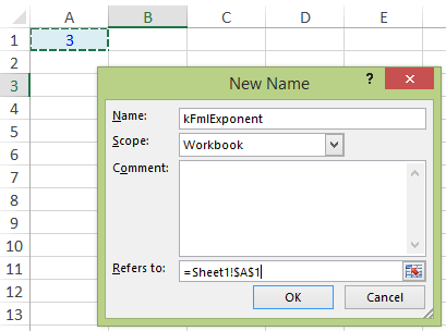 键入kFmlExponent作为名称,选择Workbook作为作用域,在注释中可以键入名称的简短描述,并在引用中选择=Sheet1!$A$1,然后只需更新该单元格中的值。
