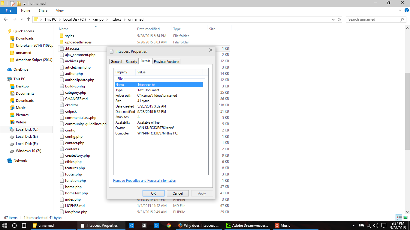 我试图使用mod_rewrite和appache将动态URL转换为静态URL。因此,我在根文件夹中创建了一个名为c:xampp/htdocs/unnamed.的.htaccess文件。但是,每当我试图将文本文档重命名为.htaccess时,它就会自动更改为.htaccess.txt。它只显示在文件夹中的.htaccess,但当我查看属性菜单中的详细信息时,它实际上是.htaccess.txt。有人知道我怎么把它改成.htaccess吗?