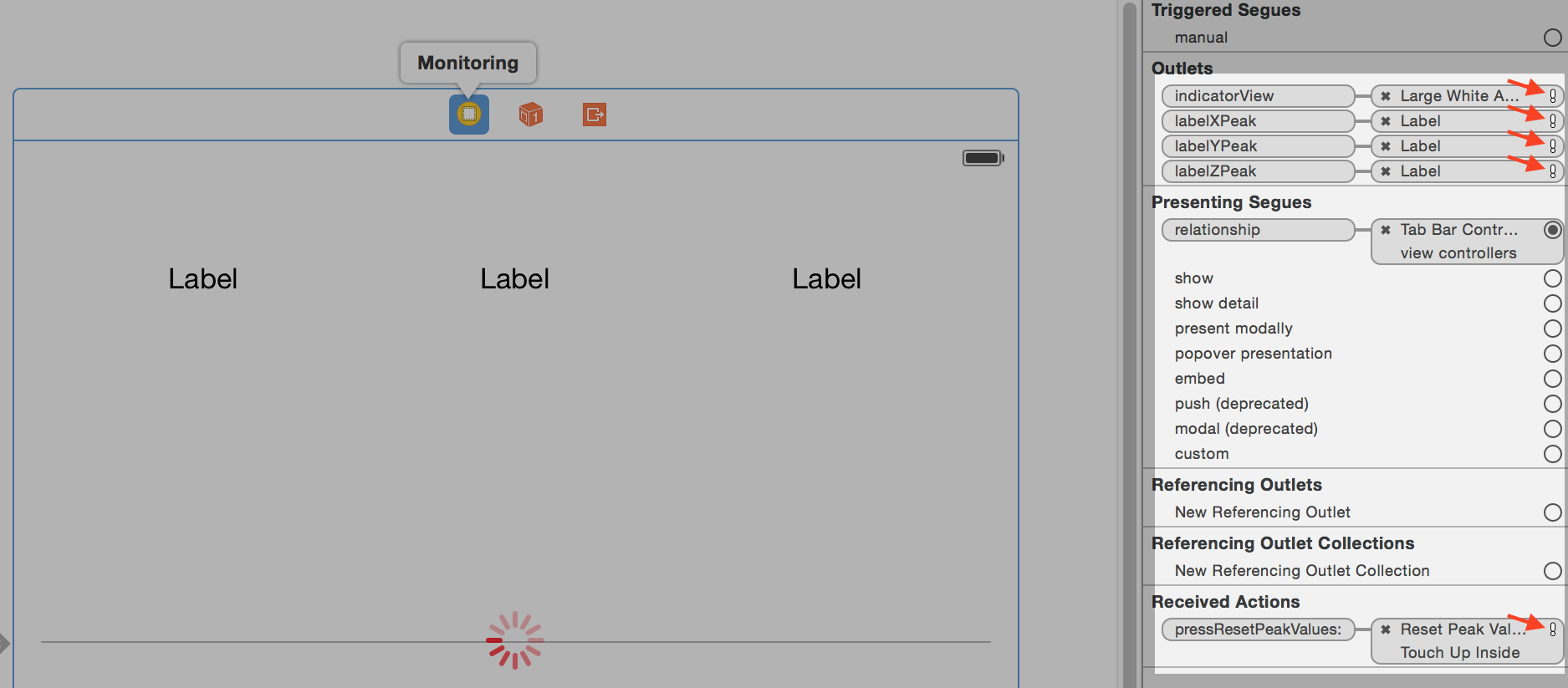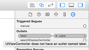另外,如果您悬停在!上,它将显示一条错误消息。如果它说"UIViewController没有一个名为labelXPeak的出口“,那就意味着基类存在问题。查看弹出错误消息报告并有助于诊断问题的类名。