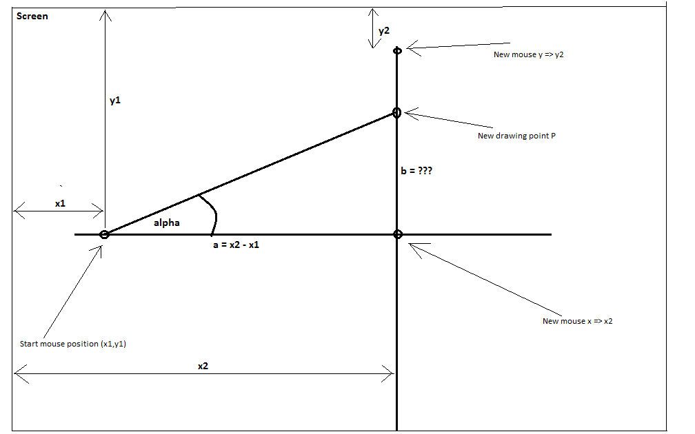 点(x1,y1)是鼠标的起点。假设鼠标已经移动到右侧的(当鼠标向左移动时必须处理这个情况),新的鼠标坐标将是(x2,y2)。然而,不想在(x1,y1)和(x2,y2)之间划线,因为这条线的斜率(角度)不是想要的。所以我们必须计算新点的坐标,,P,,站在我们的线上。注:,我假设这个点的x坐标等于新的鼠标-x坐标x2!