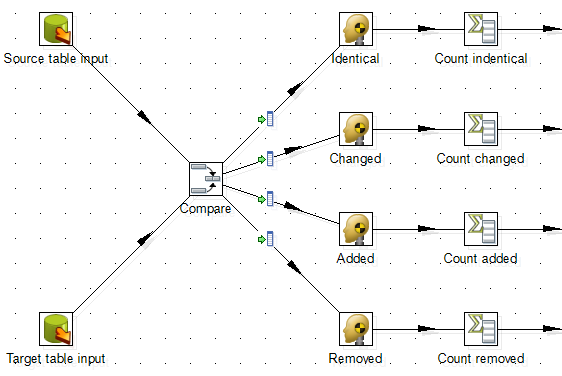 “比较字段”步骤将以2个流作为比较的输入,其输出为4个不同的流,用于“相同”、“更改”、“添加”和“删除”记录。您可以对这4条记录进行计数,然后使用Insert/Update处理“更改”、“添加”和“删除”记录。
