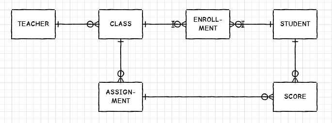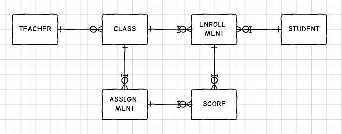 Assignment部分是由CLASS的外键识别的。这将类ID向下拉到赋值,以便由SCORE在其主键中依次引用它。SCORE与ENROLLMENT直接相关,而不是与STUDENT直接相关。这是有意义的,因为注册是属于一个班级的学生的记录,所以它更紧密地模拟了你所关心的强加的商业规则。SCORE的主键由ENROLLMENT (包括学生ID)和ASSIGNMENT (包括类ID)的外键组成。SCORE的主要关键是课堂、作业和学生的结合。如果您确保在SCORE表中只保留了一个类ID副本,那么学生就不可能在作业中获得分数,除非该学生也注册了分配该作业的班级。
