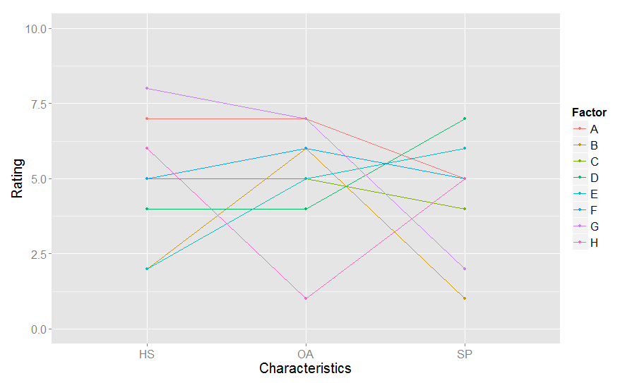 ggplot(data=d, aes(x=Characteristic, y=Rating, group=Factor, colour=Factor)) +