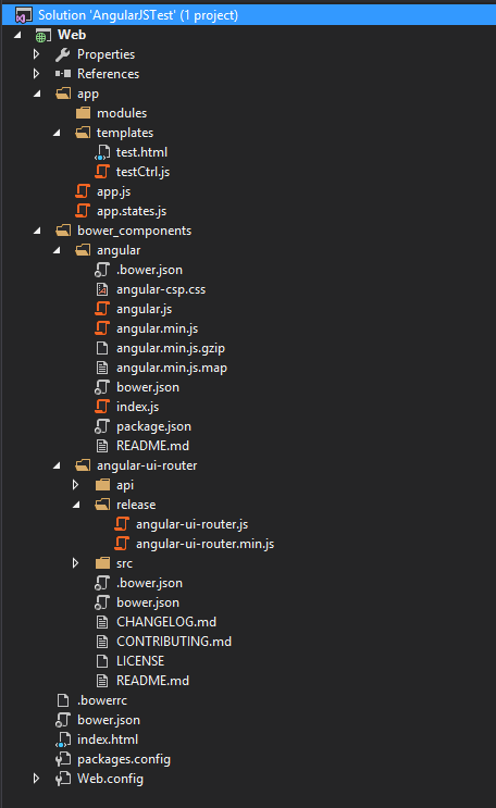 我已经在VS中设置了一个基本的AngularJS应用程序,无法使ui-路由器功能正常工作。我看过视频,博客,所以答案,据我所知,我做的一切都是正确的,尽管,我是全新的网络发展。