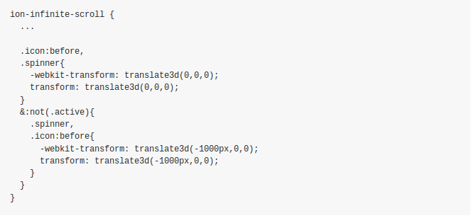 光是把旋转器翻译成视域是不够的。(为什么选择这个解决方案而不是不透明?)旋转器仍然是动画,并降低了滚动性能在iOS设备上很多。即使在视线之外。