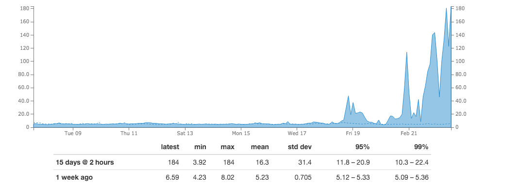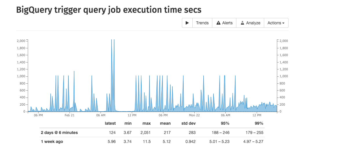 对于Google BigQuery基础设施,伙计们:我们已经运行了一组短时间运行的交互式查询,几个月来平均完成了大约5秒。从周五2/19开始,这些响应时间一直在稳步增长(SQL没有改变,我们正在处理使用滑动窗口查询的稳定数据流)