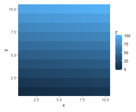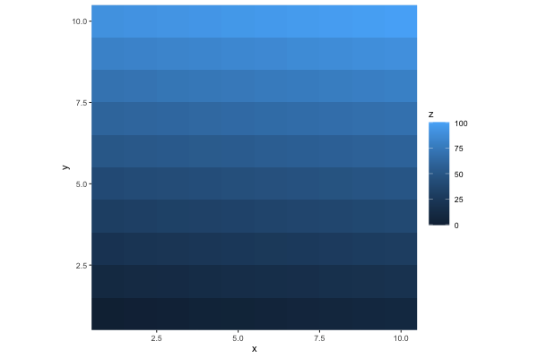 p1 <- ggplot(data=cbind(expand.grid(x=1:10, y=1:10), z=seq(0, 100, length=100)),