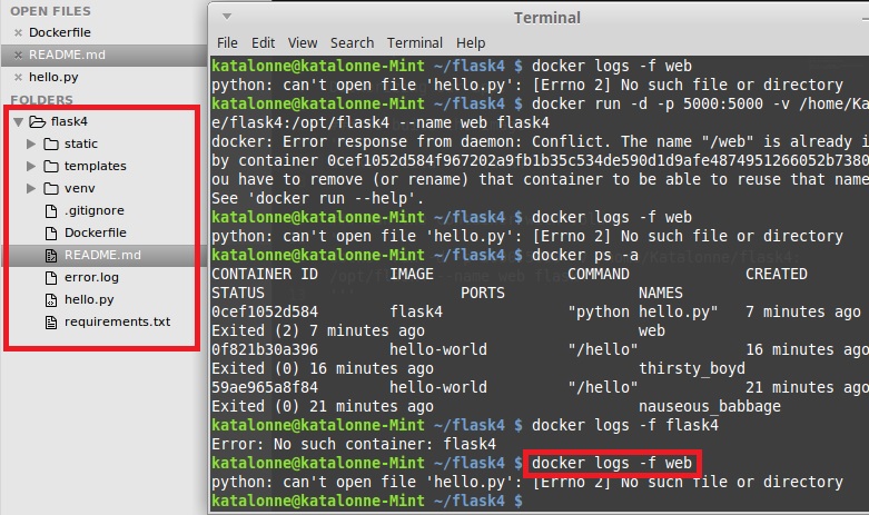 docker run -d -p 5000:5000 -v /home/Katalonne/flask4:/opt/flask4 --name web flask4当我想在容器上运行文件时: