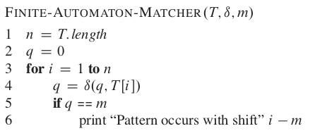在内部重复-直到循环说我们有Pq = 'abdab‘和字符串是'abdabcd',我们的字母表是abcd,我们正在寻找最好的选择,每个符号从字母表,然后存储过渡到新的状态。在以上情况下,在'a‘之前,我们应该移动到开头,'b’到最开始,c延长匹配,d符号应该在我们的初始字符串中存储指向第三个符号的指针。因此,Pqa应该从字母表中读成Pq加a字符。