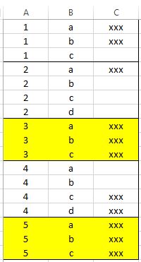 我需要为Oracle 11g编写一个查询,以便只选择图像中突出显示的组。具体来说,有3列- A、B和C列-A、B和C。