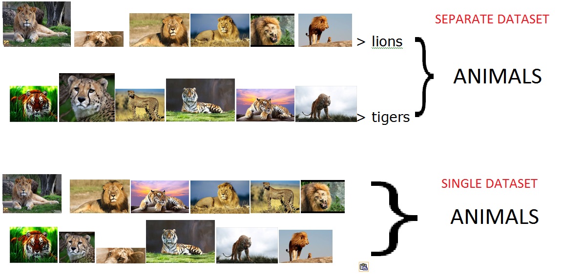 关于单独的数据集或单一数据集的培训将取决于各种因素。如果您想使用卷积神经网络将测试数据集中的图像分类,而不是进一步细分它们,那么就应该对单个数据进行培训。然而,如果你计划将图像进一步细分为老虎和狮子,那么训练需要在老虎和狮子的单独数据集上进行。