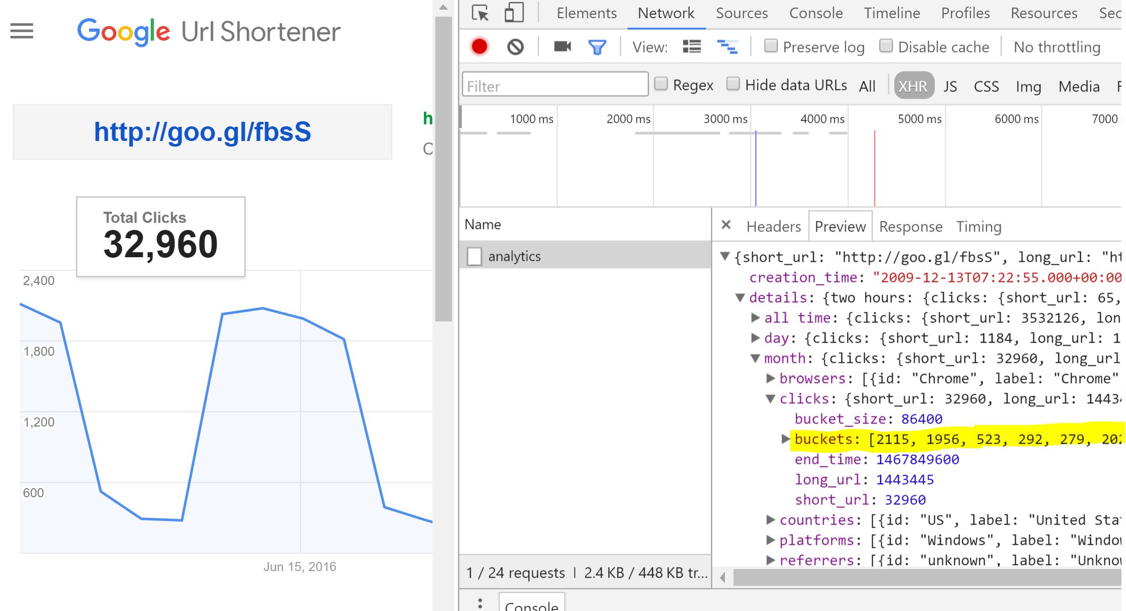 在javascript中,我试图访问谷歌的分析数据,以缩短urls,例如。我厌倦了“'URL缩短器API”,它工作得很好,我收到了数据。但是,这些数据在这里上没有关于一天中每一小时或一个月中每一天的分析报告。在这里,它有一些属性,例如“点击”和“桶”,这些属性包含了我需要的点击计数。检查下面的图像: