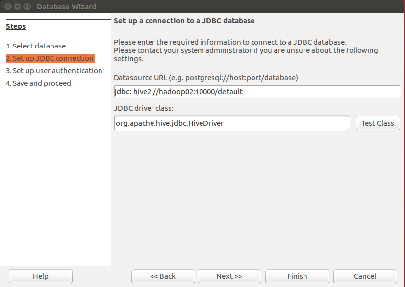 我正在尝试获得LibreOffice的Base5.1.4.2,它运行在Ubuntuv16.04上,通过JDBC连接到Hive1.2.1数据库。我将从Maven Central下载的以下jars添加到LibreOffice的类路径('Tools -> LibreOffice -> Advanced-> Class Path'):