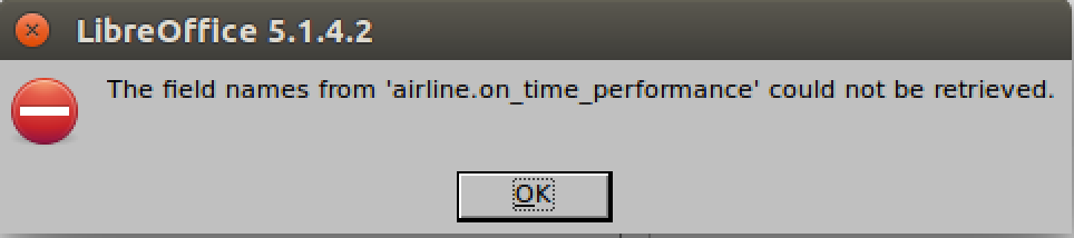 “使用向导创建查询”选项提示输入密码,然后返回“无法检索'airline.on_time_performance‘中的字段名”。