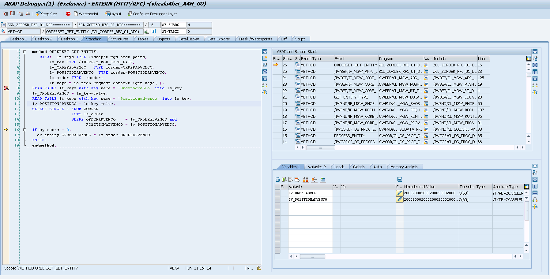 查看您的$metadata文件会发现错误。您的实体类型'Order‘有两个关键属性:'Orderadvencoinput’和'Positionadvencoinput‘。当试图访问/sap/opu/odata/sap/ZORDER_RFC_SRV/OrderSet(Orderadvencoinput='10100',时,Positionadvencoinput='10')表IT_KEY_TAB (或者在您的例子中是lt_keys)会填充这两个键。但是,您尝试从表lt_keys中读取的是填充为'Orderadvenco‘和'Positionadvenco’的名称字段的行。因此,这两个读取表总是失败的,因此ls_key仍然是初始的,因此lv_ORDERADVENCO和lv_POSITIONADVENCO是初始的。因此,SELECT将失败,subrc= 4。网关要做的一件常见事情是抛出400个HTTP,因为请求的资源OrderSet(Orderadvencoinput='10100',Positionadvencoinput='10')没有被填充(er_entity再次为首字母)。