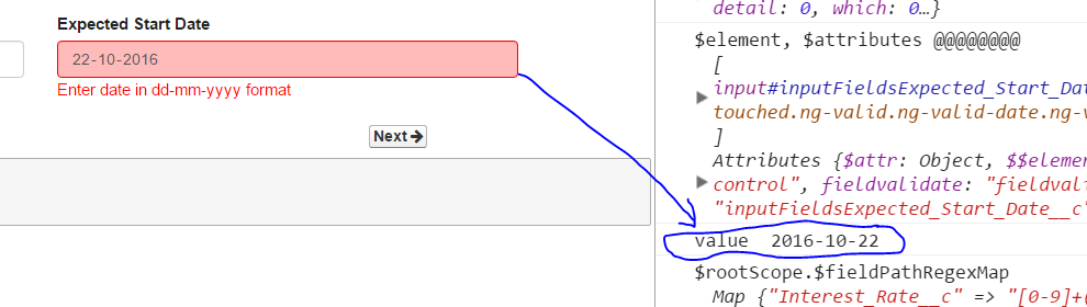 我试图在表单中为input type="date"编写正则表达式。在前端显示的格式是DD-MM-YYYY,但是当我试图在selected date value上运行正则表达式之前打印它时,它以YYYY-MM-DD格式显示。正因为如此,我的正则表达式失败了。见片段