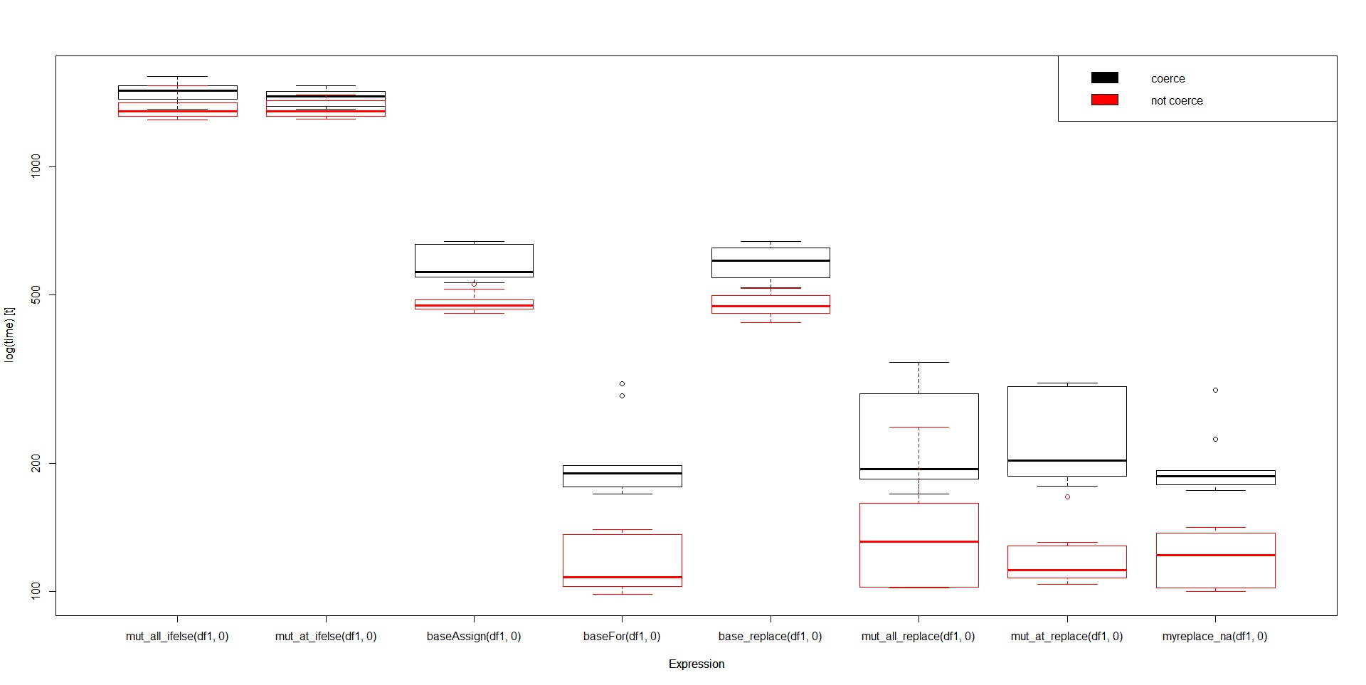 boxplot(benchnum, ylim = range(min(summary(benchint)$min, summary(benchnum)$min),