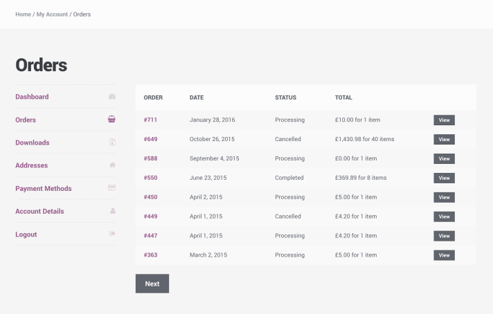 Woocommerce 2.6.x在用户帐户(我的帐户)区域有一个特殊的页面,显示用户以前的订单。