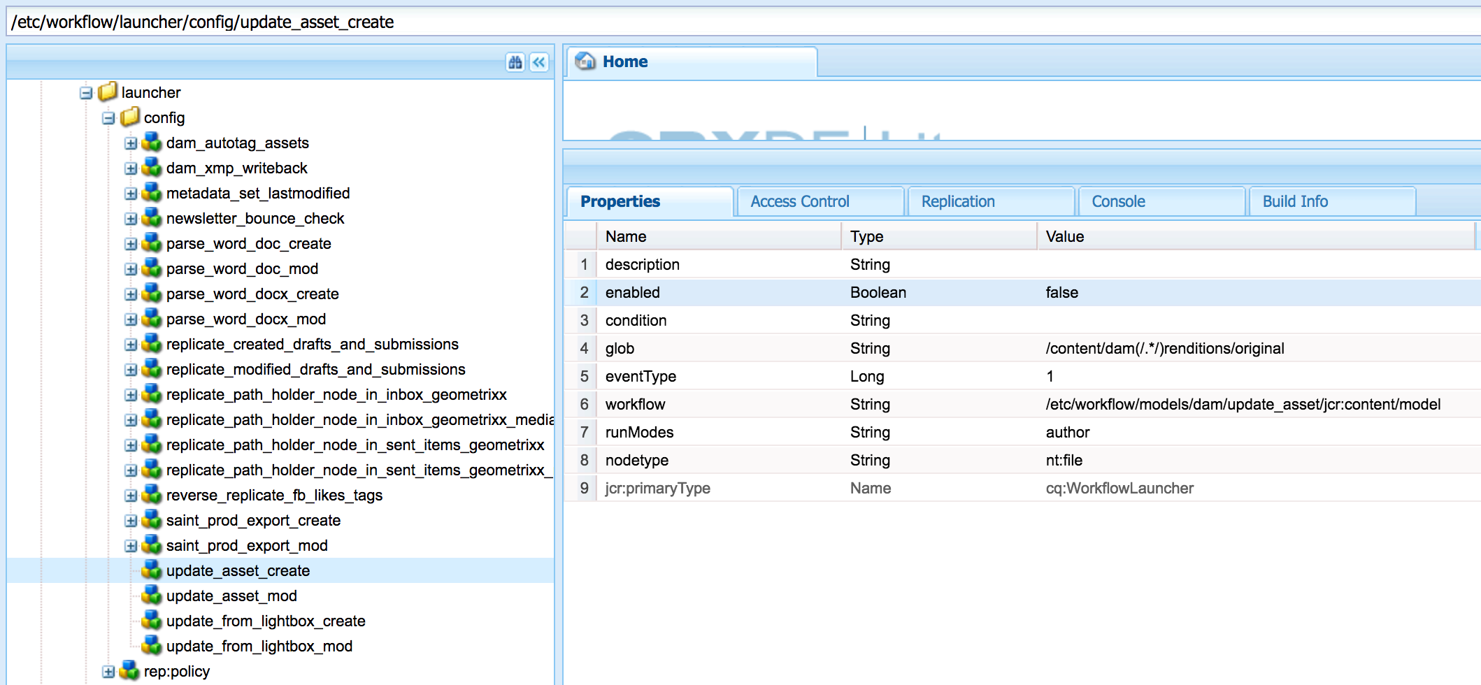 在AEM中,如果您已经将任何资产上传到DAM (即/content/dam/节点下),因为节点创建了启动程序(您可以找到http://host:port/libs/cq/workflow/content/console.html launcher选项卡)。它将触发大坝更新资产工作流模型。