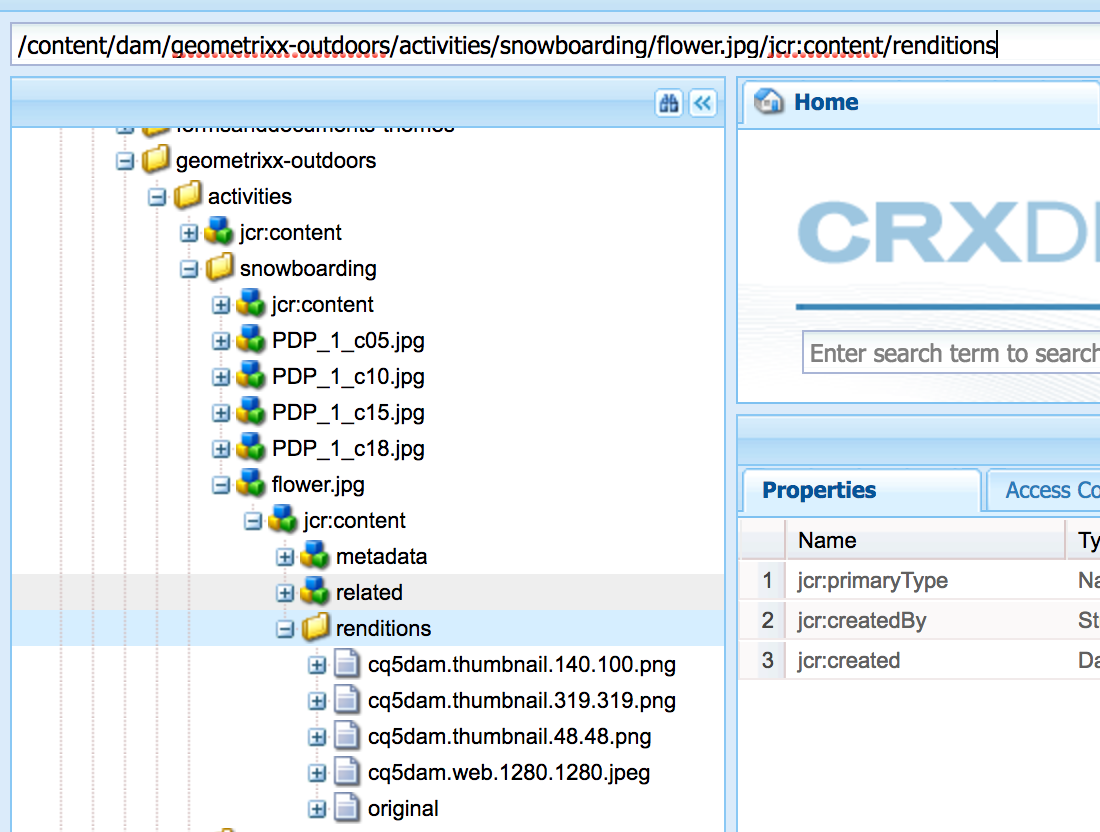 例如,:当您在完成大坝更新资产工作流之后将任何资产上传到DAM /content/dam/geometrixx-outdoors/activities/snowboarding/flower.jpg中时,呈现将在/content/dam/geometrixx-outdoors/activities/snowboarding/flower.jpg/jcr:content/renditions文件夹下创建,如下面的屏幕截图所示。