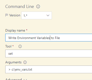 添加一个后续的命令行任务,该任务将所有环境变量写入磁盘文件,如下所示:(注意:在“参数”文本框中,将写入您和生成代理都可以访问的文件夹):