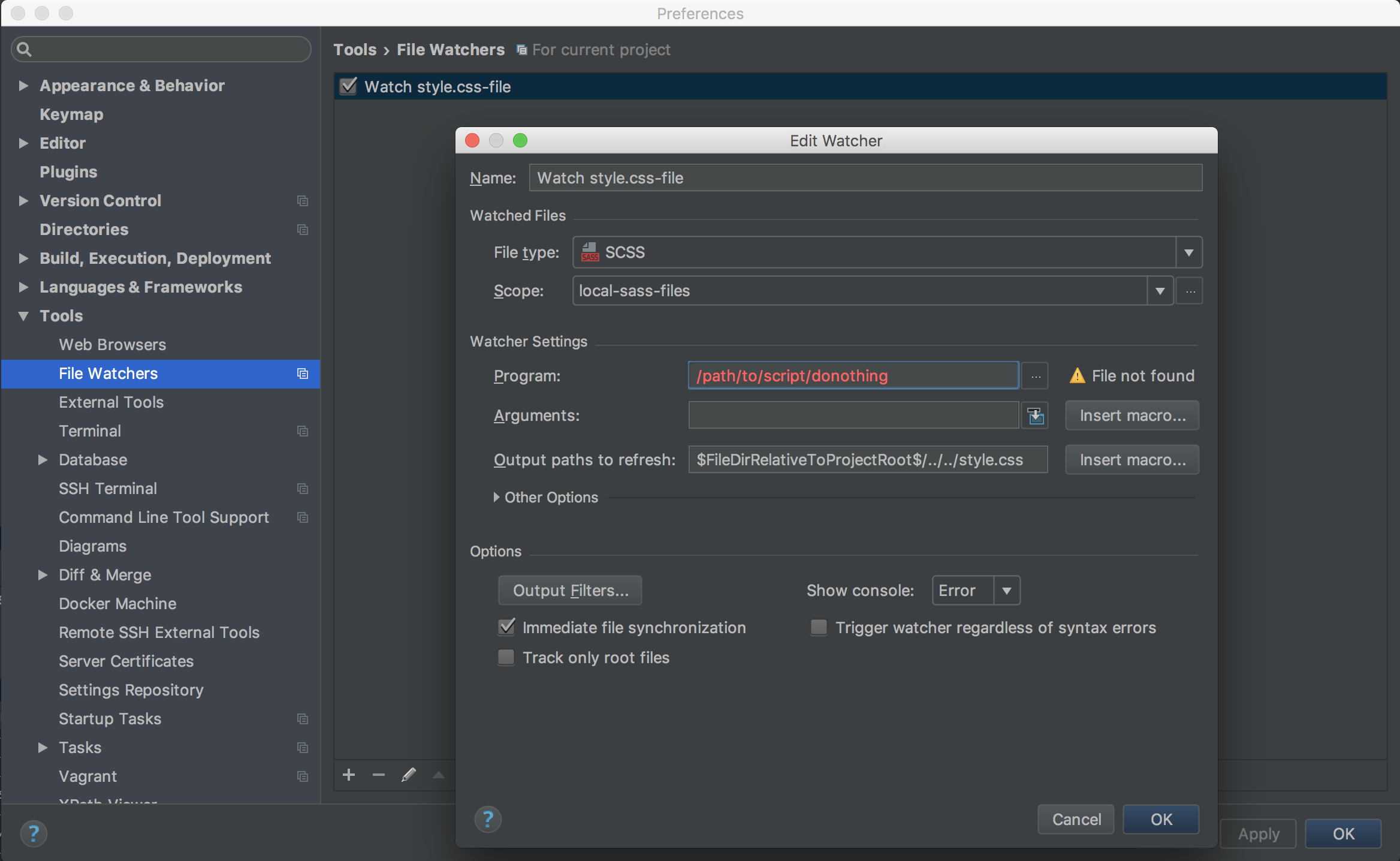 file[PROJECTNAME]:wp-content/themes/THEME_NAME/assets/sass/*但我认为范围可能只是整个项目,因为它只是寻找SCSS-文件在该范围内的变化,在“程序”被执行之前(如果我已经正确地理解了整个文件监视系统)。