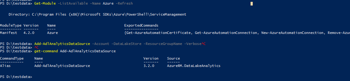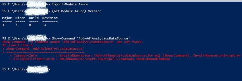 操作小组面临此命令的问题。命令AdlAnalyticsDataSource未找到。他们正在使用普通的windows服务器虚拟机进行部署,拥有Powershell版本3.4.0,我们有遗漏什么吗?