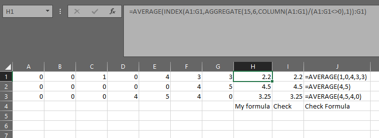 =IFERROR(AVERAGE(INDEX(A1:G1,AGGREGATE(15,6,COLUMN(A1:G1)/(A1:G1<>0),1)):G1),0)现在,如果所有条目都是0,那么它将返回0。