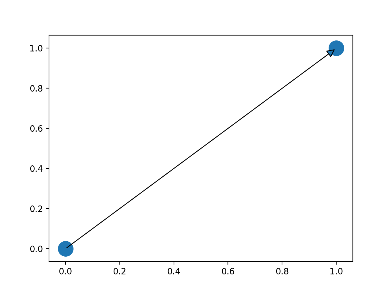 当我在大小为300的两个散点点之间绘制一个箭头时,如下所示: