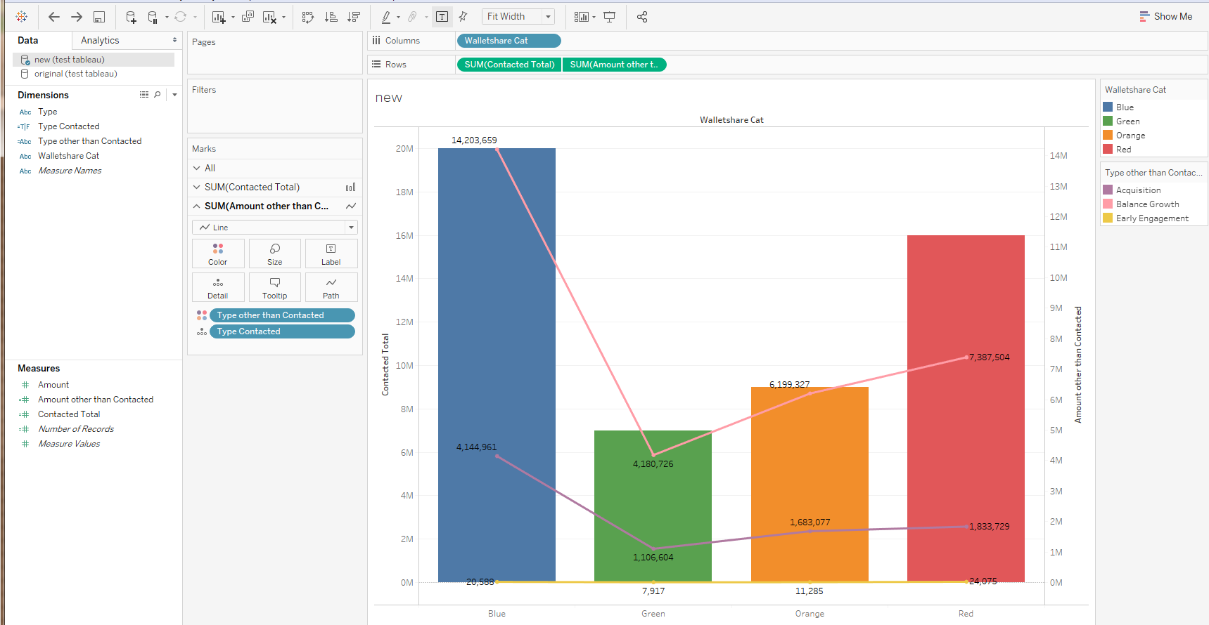 Contacted |Red |16000000然后,您可以创建一个计算公式来聚合已联系的总数和联系人以外的类型的总数。这是双轴上的两个度量。