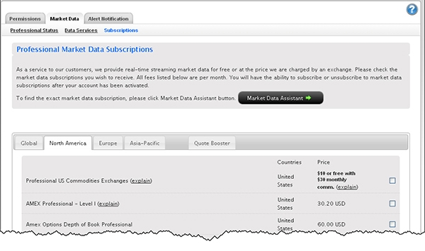 一般来说,买卖多种产品类别的客户,应考虑基本的捆绑认购,即美国证券快照和期货价值束,每月价格10美元,并提供各种美国股票、股票指数、债券、期货和期货期权的报价。在帐户至少产生30美元佣金的任何一个月内,此订阅的月费将被免除。