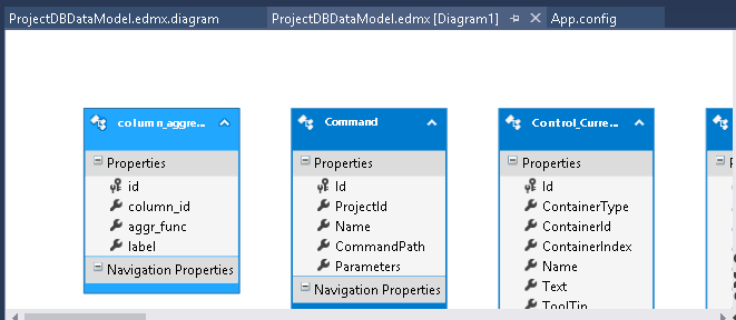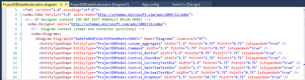 另外,关于图文件,您应该知道edmx.diagram文件是不必要的。当您使用空的edmx标记创建<Diagrams></Diagrams>文件时,当您第一次在designer中打开edmx文件时,Visual将为您创建标记的内容。然后,如果出于任何原因,您喜欢在单独的文件中使用ot,只需右键单击edmx的设计图面并选择Move Diagrams to Separate File。