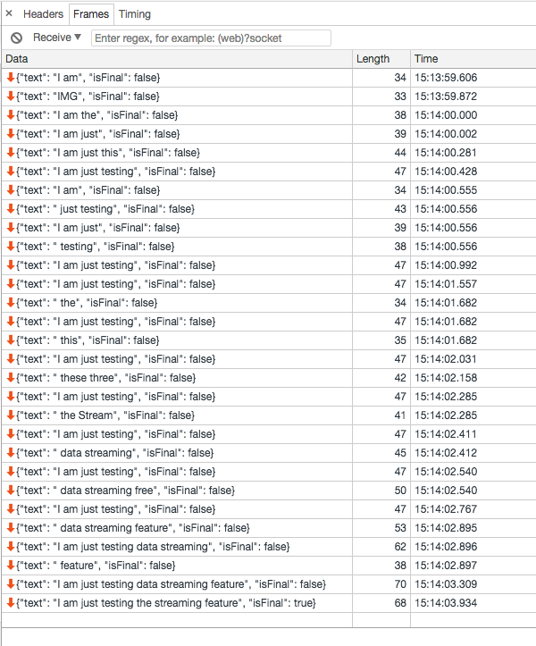 关于我所指的快速和肮脏的例子,请使用语音API页面,并在打开开发工具的情况下运行流测试。在这里,您将看到在说话时接收到的流数据: