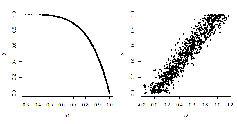 x2 = y + rnorm(1000, 0, 0.1)这里,y正好是1-x1⁶和⁶,加上了一些噪声。下面是一个帮助我们了解这一点的阴谋。