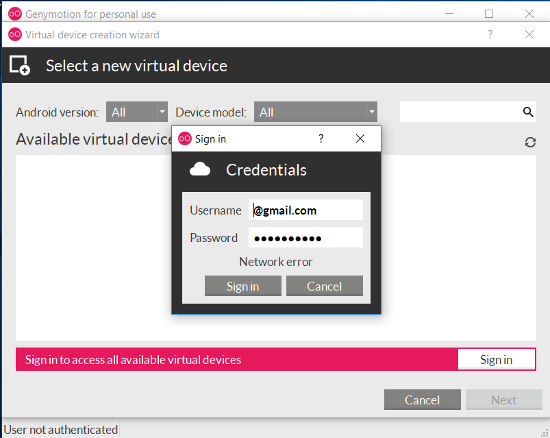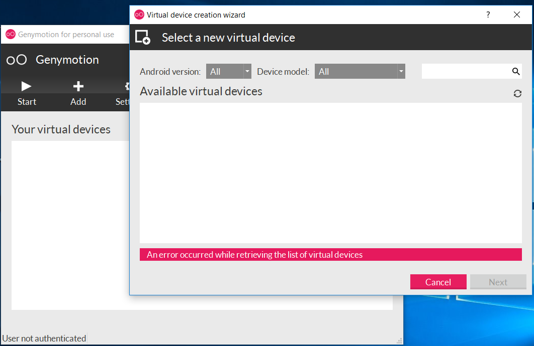 我在安卓开发中使用了Genymotion仿真程序,最初我使用的是android模拟器。我刚刚开始为android应用程序进行调试和测试。我下载了genymotion .exe文件.exe 1,在我的windows笔记本上安装了Genymotion和虚拟设备。2.安装成功后,无法添加模拟器和显示网络错误等。下面我上传了屏幕截图。