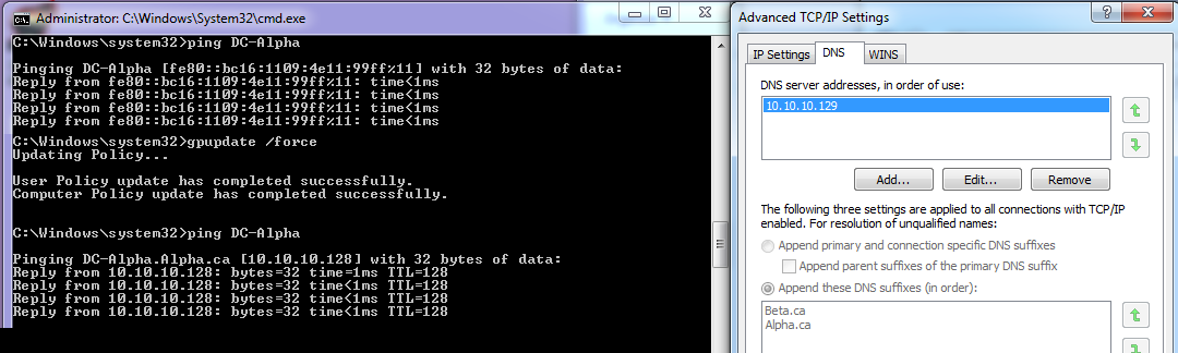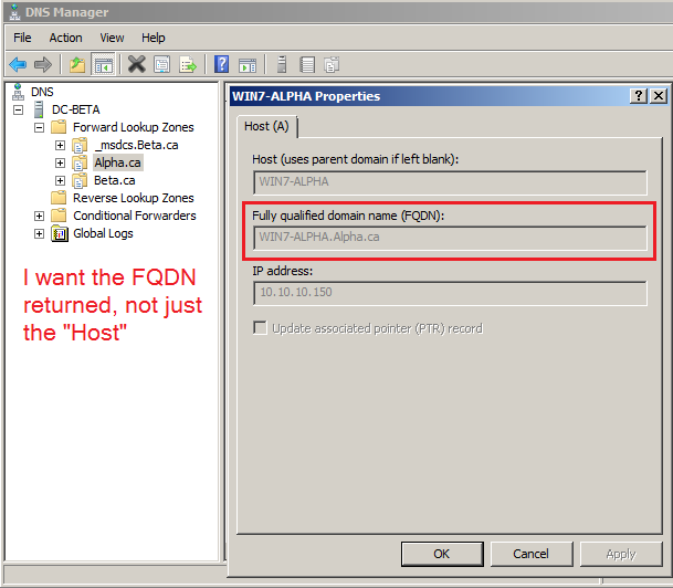}但是,如果我在"Beta.ca“域上尝试相同的操作,它只返回"Win7-Alpha”。如果它被传递,它就能够解析IPv4地址,但同样,它只返回“Win7-Alpha”.我不想要“Win7 7-Alpha”,我要FQDN!