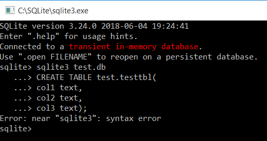 时,它只会把我带到一个新的行上,而没有创建任何数据库。我认为我也必须向数据库中添加一个表,所以我创建了一个表,一旦完成了,Error: near "sqlite3": syntax error